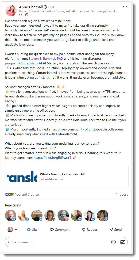 Speaking for myself personally, one of the reasons why I signed up here was because I want a one-stop shop to learn an entire tool and process. Because what I don’t personally like is going out onto the Internet and picking and choosing from multiple sources. I find it overwhelming. And this is like, there’s a lot of information in what you’re providing and lots of different individual courses and video modules, but it’s all in one place. And so it’s like if what you want is to learn how to be in the driver’s seat and use AI for both post editing and translation, CotranslatorAI is how you can do that. And here is the one-stop shop for everything you’re going to need to know, including live coaching. That is like the succinct version. I want to learn about AI, I want to be in the driver’s seat and I want to have a future in translation. And this is one of the ways to do that. So like those punchy one liners like use AI for translation, use AI for post editing, because reality is they’re going to ask us to post edit. That’s sort of my personal view on it. I was feeling overwhelmed trying to cast about across the whole Internet for all these different tools and everybody has a take on AI. I just want to start in one place and go down the rabbit hole. And that’s what this course helps with in my view.